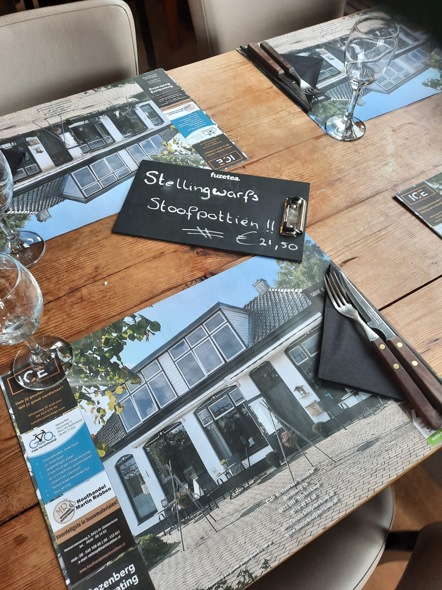 Bi’j kefé-resteraant Boszicht in Ni’jberkoop kuj’ verhipte lekker eten. Zoas bi’jglieks et Stellingwarfs Stoofpottien!! Hans Salverda zien fiets vaalt daor ok nogal es omme… en maekte d’r kotleden ok disse foto.